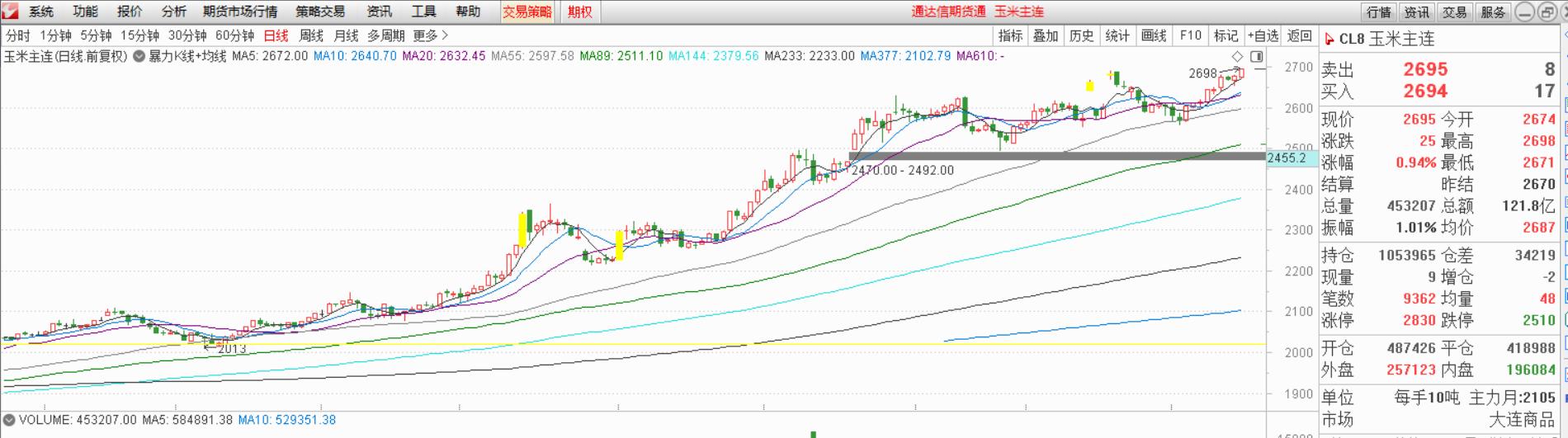 图为2020年12月玉米期货的主力合约走势图及期权T型报价图